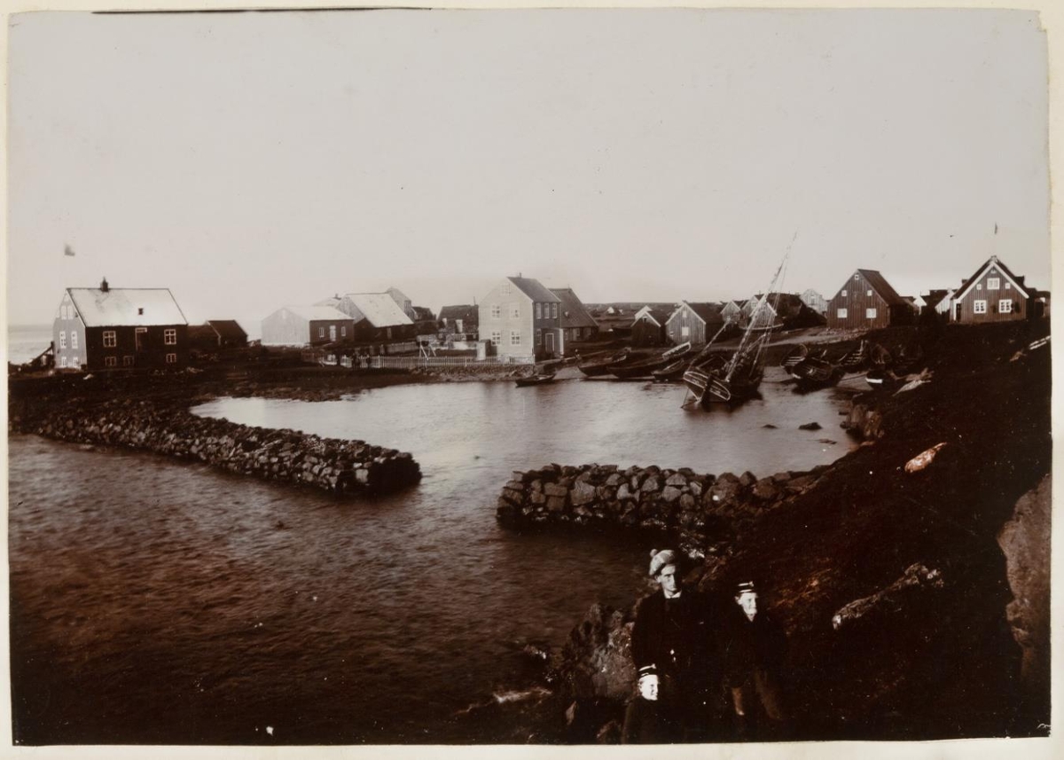 Flatey. Silfurgarðurinn svokallaði fyrir miðri mynd. Seglskúta á þurru inni á voginum. Fremst t.h. stendur ungur karlmaður og tveir strákar.