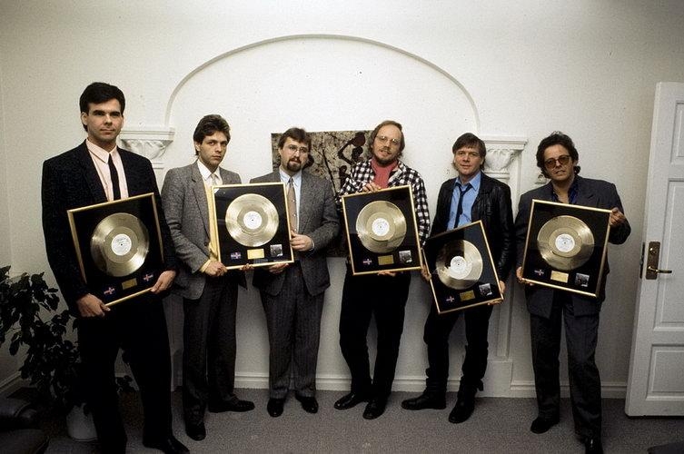 Aðstandendur plötunnar „Hjálpum þeim“ þar sem hún er komin í gull. Ljósm: ?