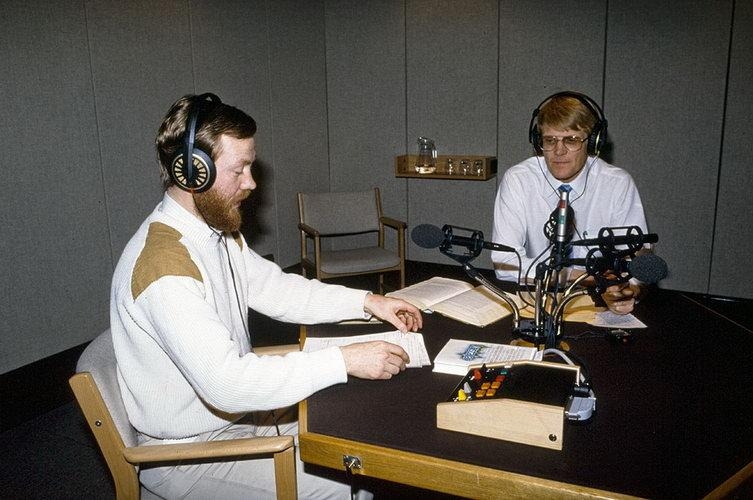 „Ólafur Torfason að taka viðtal við séra Pálma Matthíasson prest Glerárkirkju.“ (HG 2015)