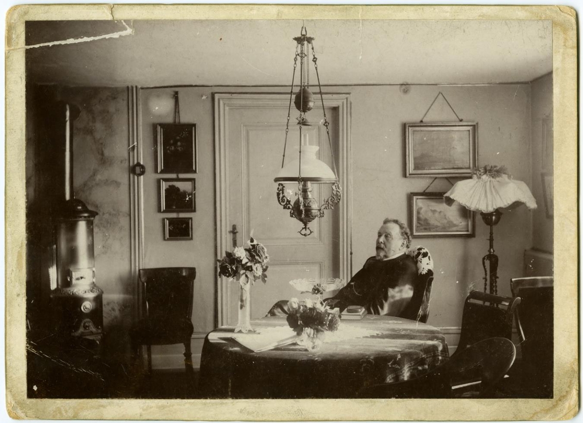 karlmaður situr við kringlótt borð með blómum í vösum. Skrautlegur olíulampi