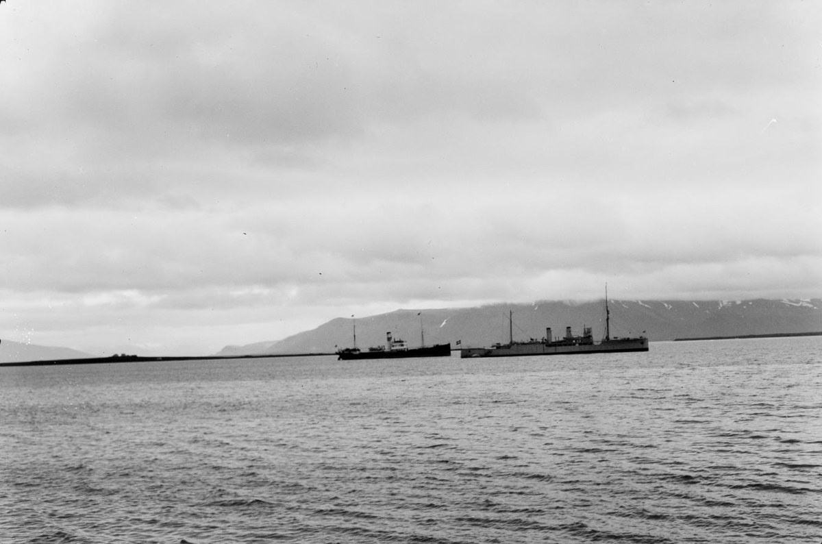 Reykjavíkurhöfn. Reykjavík. Tvö skip á legu á höfn. Annað þeirra er líklega danskt herskip. Konungsheimsóknin 1921.