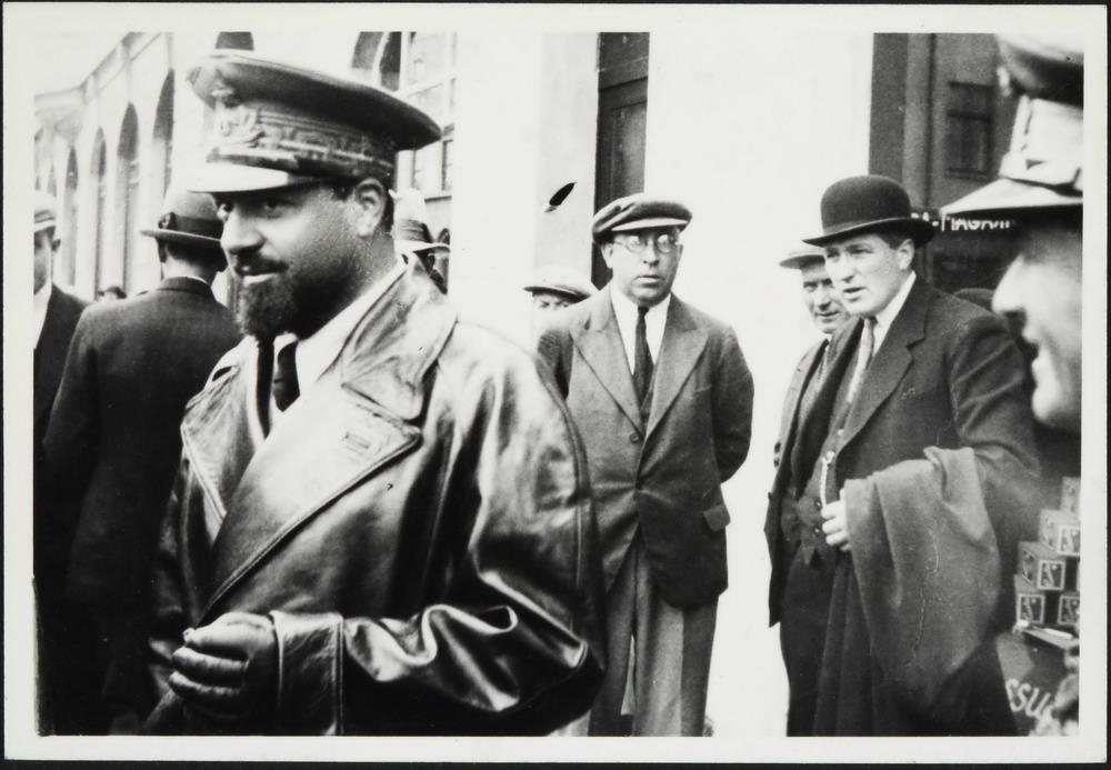 Eftirtaka. Í forgrunni er karlmaður í einkennisklæðnaði hermanna, leðurfrakka og með kaskeiti, er með yfirskegg og hökutopp. Í baksýn eru fleiri karlmenn í borgaralegum klæðum og súlnagangurinn við Hótel Borg. Úr syrpu af myndum teknum í tengslum við hópflug Ítalska flugforingjans Balbos til Ameríku sumarið 1933. Í tengslum við myndina er skrifað á síðuna: 'við Hótel Borg'. Í meðf. skrá stendur: 'Balbo - Pósthússtræti, RVIK 5.7. 1933'.