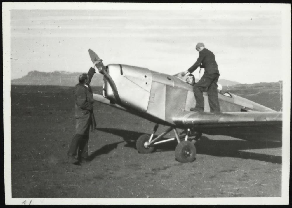 Eftirtaka. Myndin er tekin framanfrá af hlið lítillar einshreyfils vélflugu, Klemm L25, flugmaðurinn situr í vélinni og annar í sæti fyrir aftan hann. Á væng vélarinnar stendur karlmaður og annar fyrir framan hana og teygir sá sig í skrúfublað vélarinnar til að gangsetja hana. Úr syrpu af myndum teknum í tengslum við starfsemi íslenskra svifflugáhugamanna á Sandskeiði. Í tengslum við myndirnar er skrifað á síðuna: 'Svifflugfélag Íslands' og 'Sandskeiði 1938'. Í meðf. skrá stendur: „Klemm L25 á Sandskeiði 1938. Ljósm. Sig. Jónsson.“