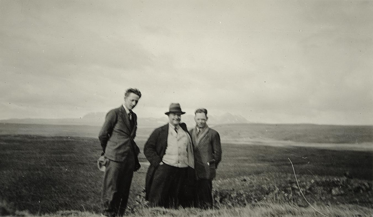 Þrír karlmenn í forgrunni, sléttlendi