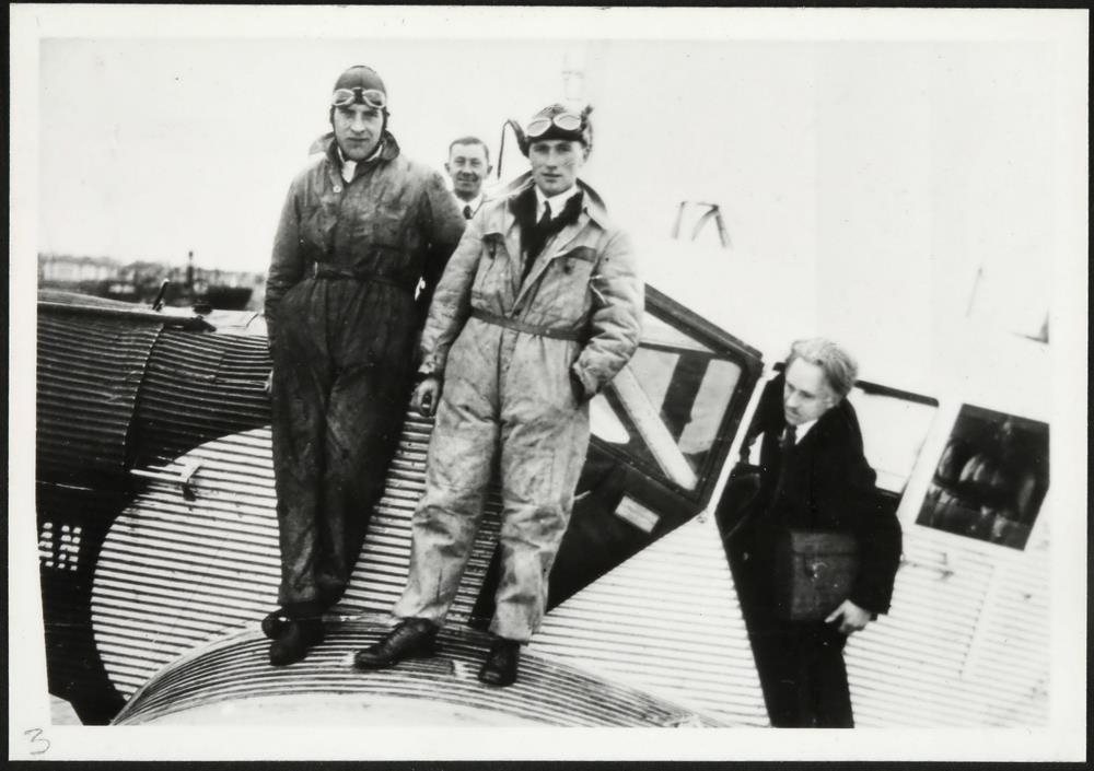 Eftirtaka. Myndin sýnir hluta af flugvél, stjórnklefa og hluta af væng, vélin er tvílit, ljós með dökkt nef. Á vélinni eru fjórir karlmenn, einn er að koma út úr stjórnklefanum með skjalatösku í hendi, tveir standa á vængnum og halla sér að skrokknum og sá fjórði stendur á vængnum hinum megin við stjórnklefann. Í baksýn grillir í nokkur hús. Úr syrpu af myndum af Sigurði Jónssyni, fyrsta ísl. atvinnuflugmanninum. Í tengslum við myndina er skrifað á síðuna í einföldum ramma: 'Sigurður Jónsson. Fyrsti íslenzki atvinnuflugmaðurinn'.