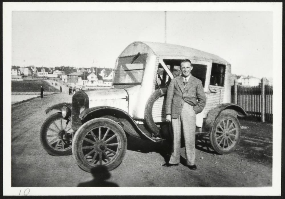 Eftirtaka. Myndin sýnir karlmann standa við hlið fólksbíls af eldri gerð og er húsið greinilega heimasmíðað. Í baksýn er Skothúsvegurinn og Þingholtin. Úr syrpu af myndum af Sigurði Jónssyni, fyrsta ísl. atvinnuflugmanninum. Í tengslum við myndina er skrifað á síðuna í einföldum ramma: „Sigurður Jónsson. Fyrsti íslenzki atvinnuflugmaðurinn“. Um myndina segir í meðf. skrá: Gamli Ford/leifar af VEIÐIBJÖLLUNNI.