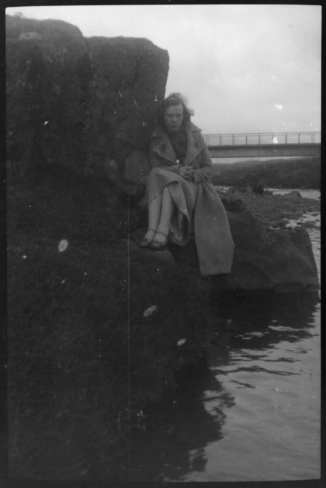 Stúlka situr á steini undir klöpp