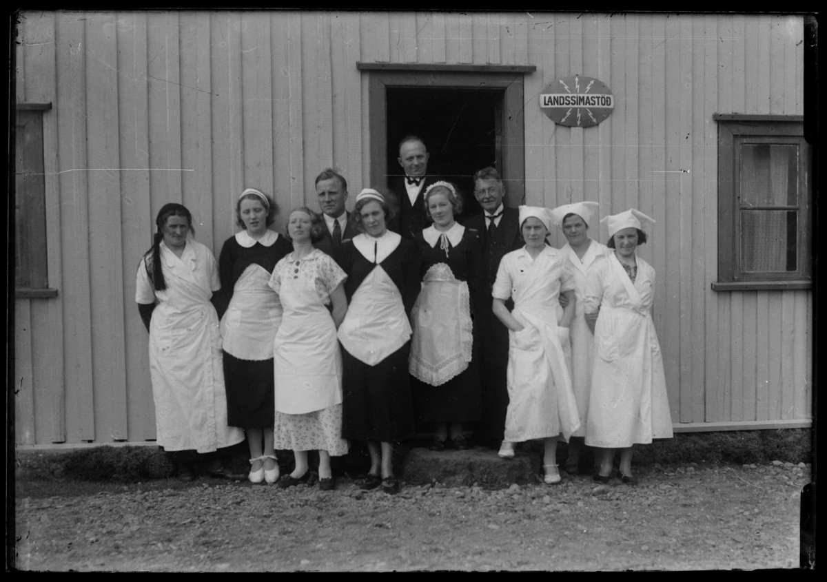 Hópur veitingafólks á tröppum húss símstöðvar sbr. merki.