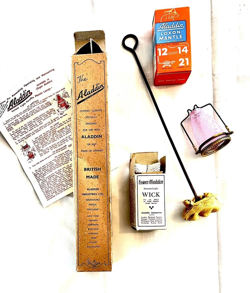 Aladdin "chimney cleaner". Gripurinn er í upprunalegum brúnum kassa með bláum stöfum. Einnig lampakveikur og aukayhlutur í Aladdin lampa.