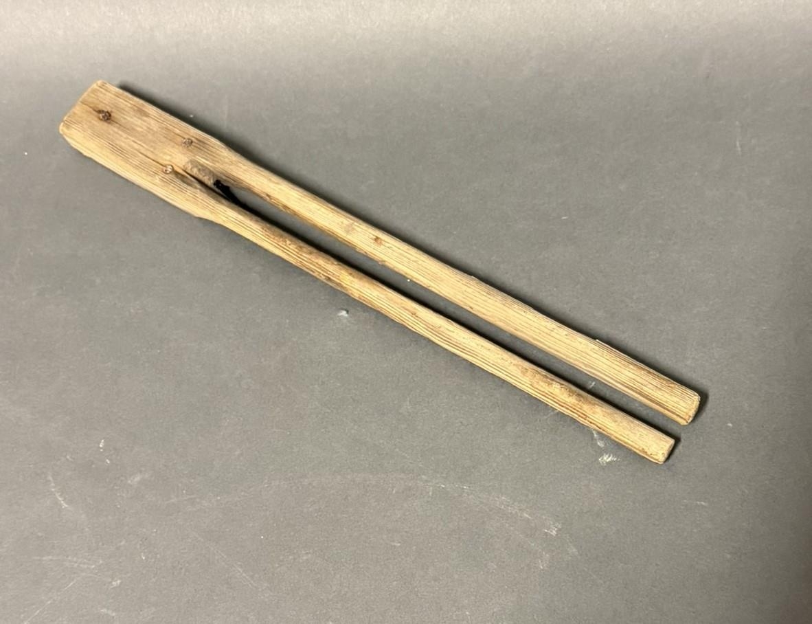 Gataður trétittur. Virðist tól þess gerður að festa niður yfirbreiðslur á hey á túnvelli. Lengd 15,5 cm.