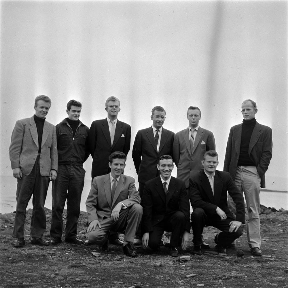Íslensku varðskipsmennirnir sem voru fangar breta í landhelgismálinu, eftir að þeir höfðu farið í handtökuferð um borð í breskan landhelgisbrjót. Þeir voru fluttir sem fangar yfir í herskipið Eastbourn þar sem þeim var haldið í 10 daga. "Luxuslíf. Tveir bjórar á dag", sagði Óli Valur Sigurðsson, skipherra, sem þá var háseti og einn hinna handteknu. Fangarnir voru settir í árabát að næturlagi rétt undan við Keflavík og þurftu að róa í land. Eastbourn þurfti að komast til Bretlands. Þessi mynd er tekin af föngunum í Selsvörinni í Reykjavík eftir ævintýrið.