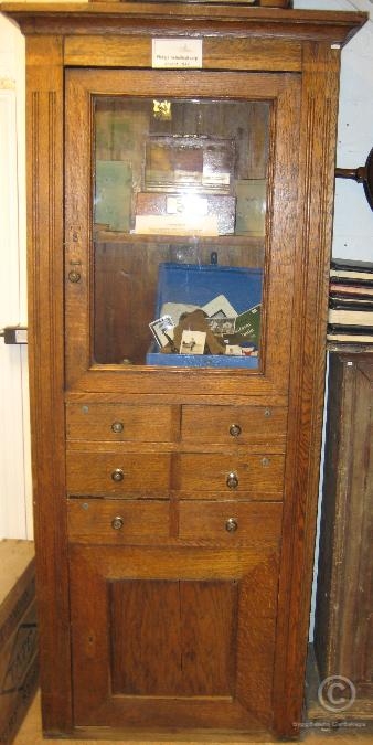Skápur úr harðvið með tveimur glerhurðum og sex skúffum. Skápurinn er sagður vera frá Landsbanka Íslands, hægt er að læsa flestum hirslum skápsins. Gefandi: Hreinn Guðbjartsson (1938 - 2022), lengi búsettur í Garðinum.