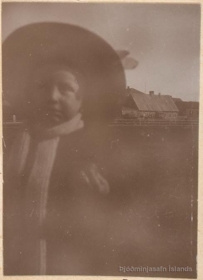 Lítill drengur með hatt og trefil. Fjær sér í hús.