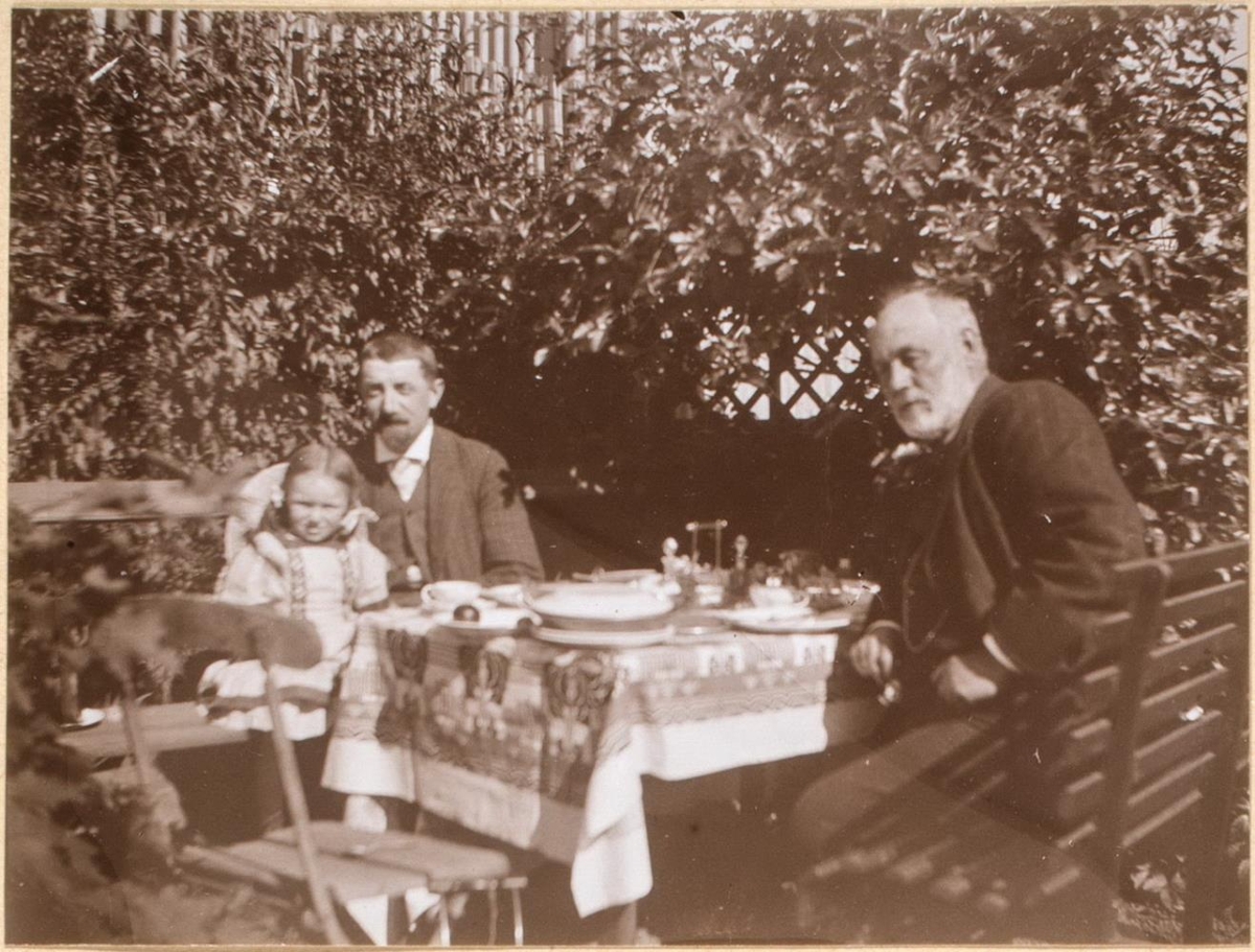 Tveir karlmenn og lítil stúlka sitja við borð úti í garði, á borðinu er borðbúnaður. Hér eru samankomnir þrír ættliðir.