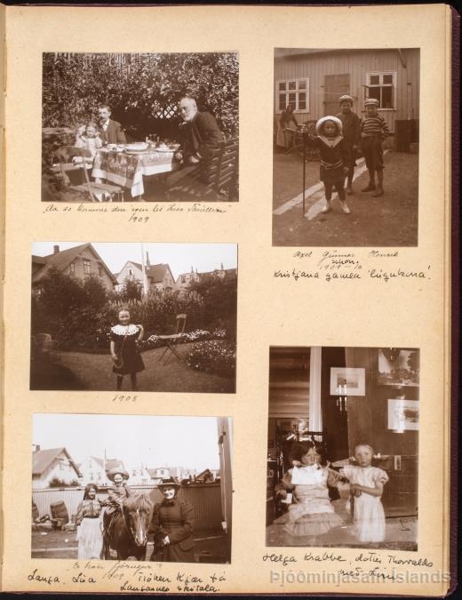Albúm með 32 spjöldum og innlímdum 132 ljósmyndum, bæði inni- og útimyndum. Skrifaðar skýringar við myndirnar: