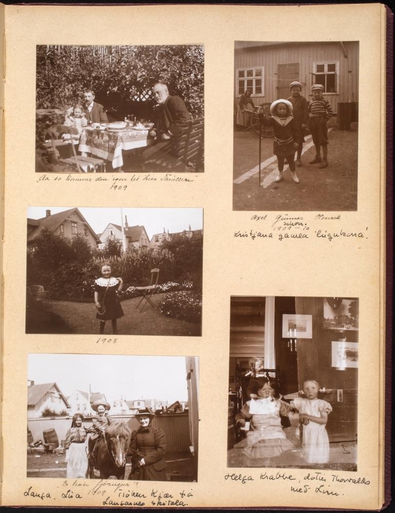 Albúm með 32 spjöldum og innlímdum 132 ljósmyndum, bæði inni- og útimyndum. Skrifaðar skýringar við myndirnar: