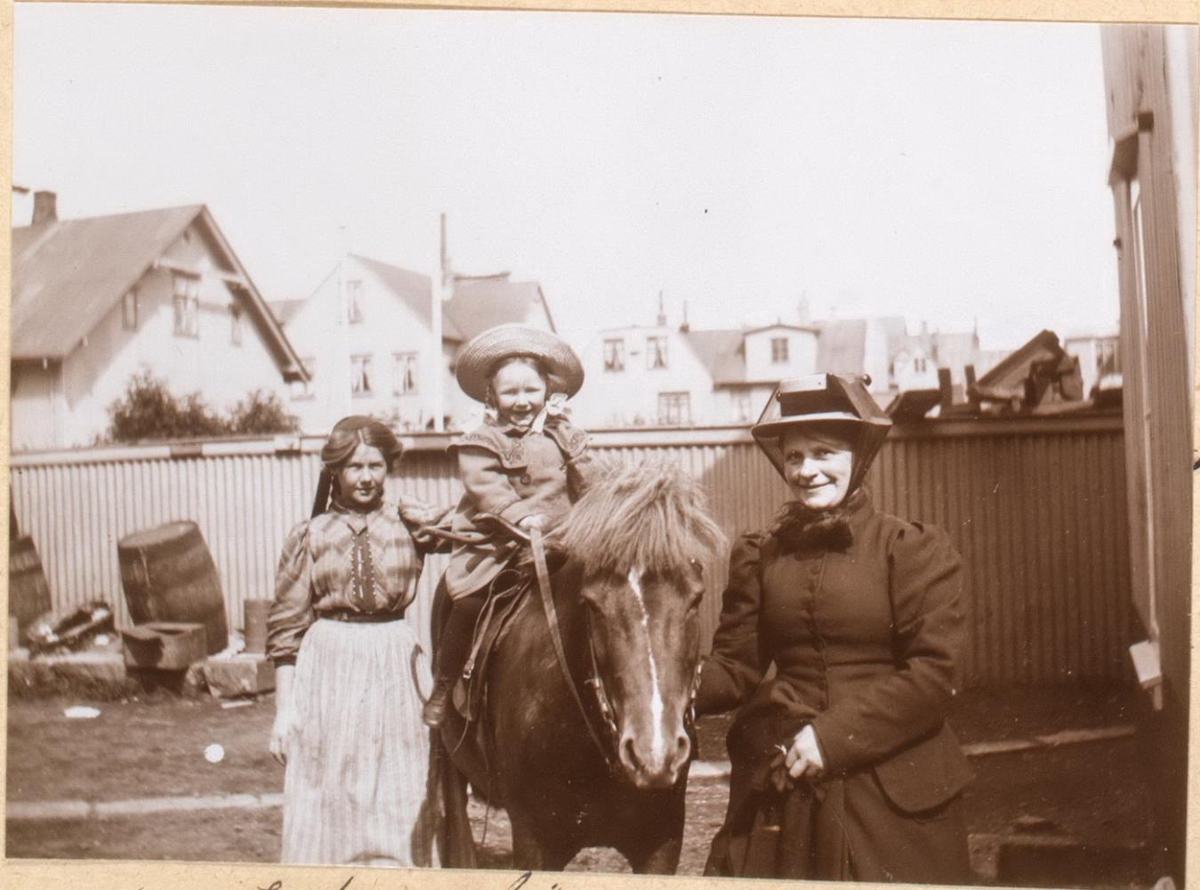 Lítil stúlka situr á hestbaki, kona heldur í tauminn og unglingsstúlka heldur við litlu stúlkuna. Fjær eru hús.