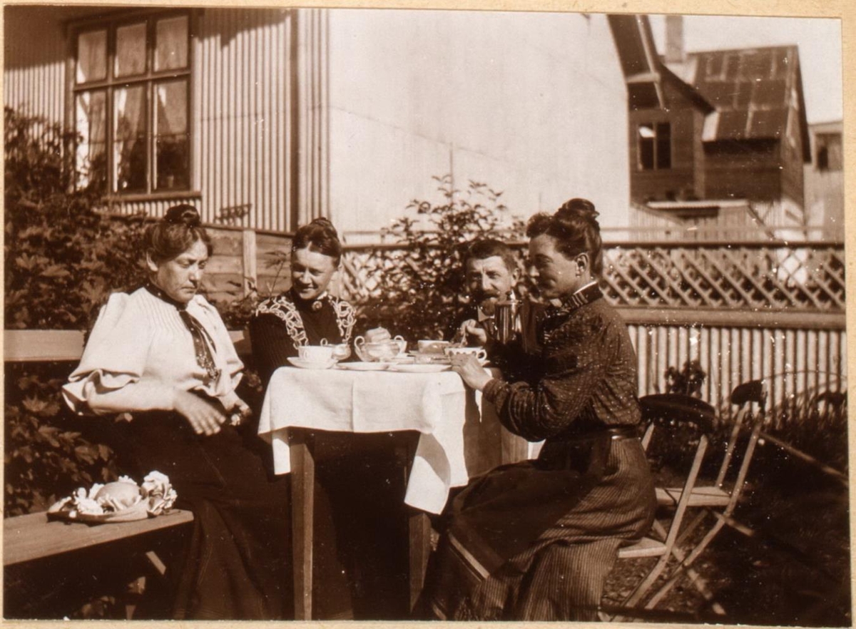 Þrjár konur og einn karlmaður sitja úti við dúkað garðborð og drekka kaffi og spjalla saman. Fjær sér í íbúðarhús.