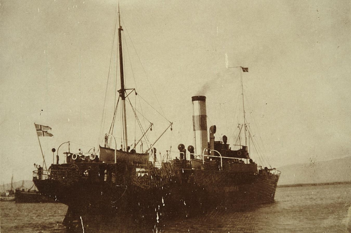 Farþegaskip, gufuknúið, á hægri siglingu út úr höfn.