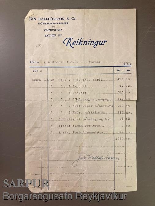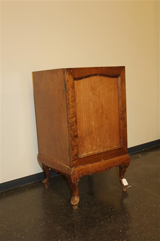 Náttborð úr hnotu með fulningahurð að framan, inní eru hillur og ein skúffa. Borðið stendur á fjórum renndum fótum. Ljós marmaraplata fylgir. Hluti af svefnherbergissetti.