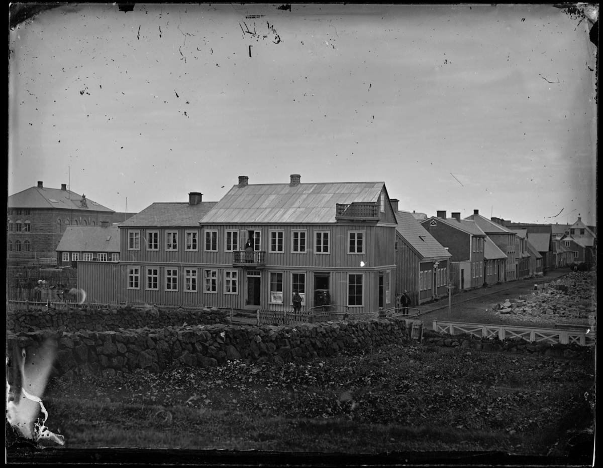 Tvílyft timburhús með bárujárnsþaki. Með þremur inngöngum og tvennum svölum. Þrír menn standa við húshornið. Í forgrunni matjurtargarður með hlöðnum vegg og grindverki. Til vinstri steinhlaðið hús og timburhús en t.h. sést húsaröð við götu og tilhöggnir steinar og þ.h. handan götunnar.