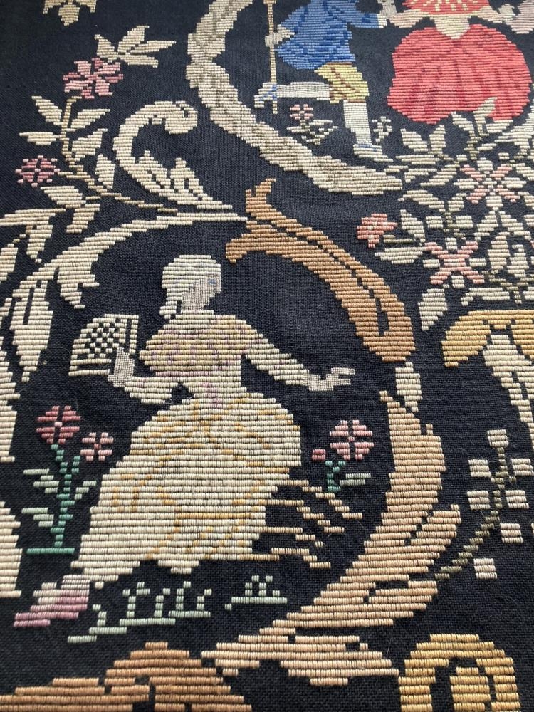 Veggteppi, gobelinsaumur í litum, 167 x 104 cm. Jurtaskreyti og fólk við hljóðfæraleik og dans. Verk Guðrúnar Ólafsdóttur frá Kirkjulandi, f. 1895, d. 1990. Er með tréfestingum á endum stofuprýði um mörg ár hjá Guðrúnu. Saumað um 1940.