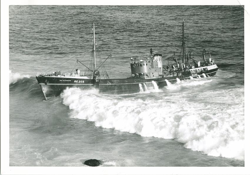 Myndin sýnir togara á strandstað, skipið er ennþá nokkuð utarlega í brimgarðinum og á réttum kili. Á kinnungnum bakborðsmegin má lesa nafnið: Jón Baldvinsson RE 208. Fremst í mynd stendur klettshaus uppúr sjónum. Allnokkuð brim er á strandstað.