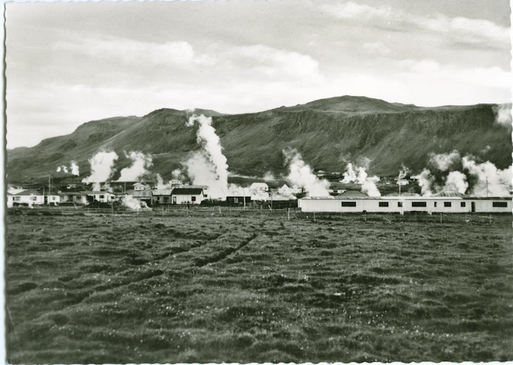 allhátt fjall í baksýn, gufumekki leggur upp hér og þar um bæinn.