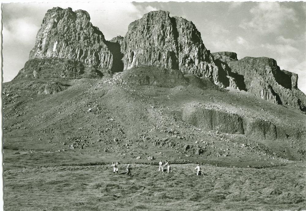 á þýfðu túni og vinnur fólkið með hrífum eingöngu. Í baksýn mjög klettótt