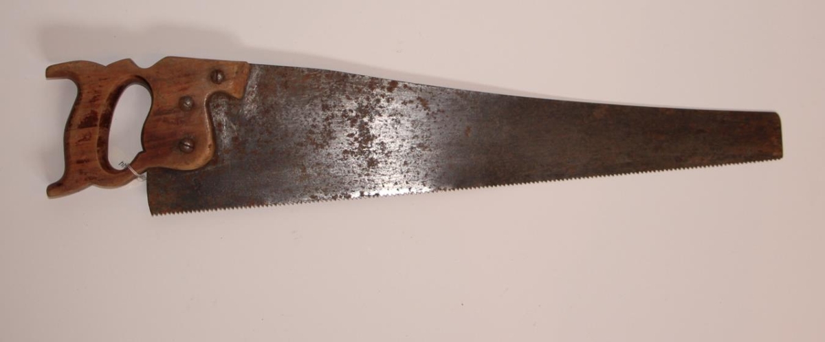Sög úr stáli með tréhandfangi, L. 64 cm, br. 13,5 cm. Handfang hefur verið rauðbrúnt á litinn. J.B er grafið í handfangið öðru megin, en hinu megin er axpuntur. Fest á blað með þrem skrúfum. Stimpill er á miðjuboltanum WARRANT SUPERIOR.