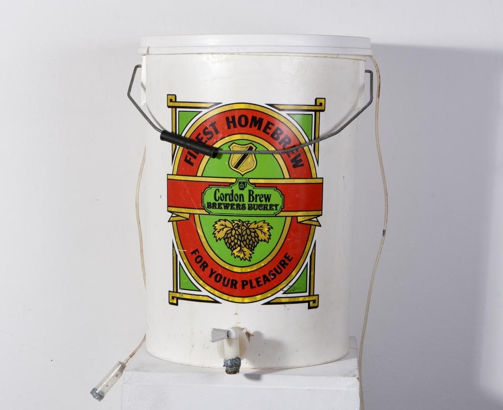 Plastfata með loki og stút að neðan - hönnuð fyrir heimabrugg. Á fötunni stendur: 'Finest Homebrew - For your pleasure'. Stúturinn neðst er með loku - hægt að hleypa innihaldinu út. Á stútnum eru leifar af kennaratyggjói. Með fötunni fylgir glær æðaleggur með dropaskammtara og hjóli sem getur lokað og opnað fyrir rennsli í gegnum legginn. Á öðrum enda leggsins eru leifar af kennaratyggjói - sá endi var festur fið stútinn á fötunni. Þegar verkið var sett upp í Listasafni Akureyrar, þá hékk fatan upp í loftinu, æðaleggurinn var festur við stút fötunnar og hann látinn leiða inn í næsta vegg. Úr fötunni, í gegnum legginn og inn í vegginn rann þag.