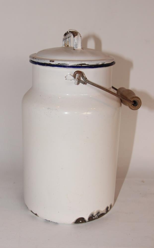 Mjólkurbrúsi úr emaljeruðu járni. H. 24 cm, þv. 13 cm. Mjókkar aðeins upp að stút. Blá rönd er í barm brúsans, sem annars er hvítur. Lok er á honum með handfangi. Handfang er grá járnlykkja með tré. Brúsinn er skellóttur að utan.