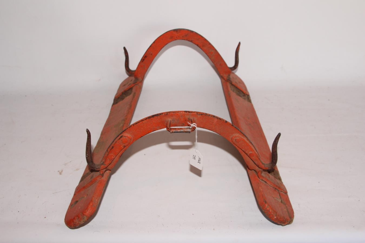 Klyfsöðull úr tré og járni. Appelsínugulur á litinn. L. 49 cm, br. afturhluta 37,5 cm. Tveir krókar á hvorum boga. Á aftari boganum er festing fyrir reiða. Járnið er hnoðað á timbrið með tveimur hnoðum hvoru megin. För eru á timbrinu eftir önnur járn sem skipt hefur verið út fyrir þessi.