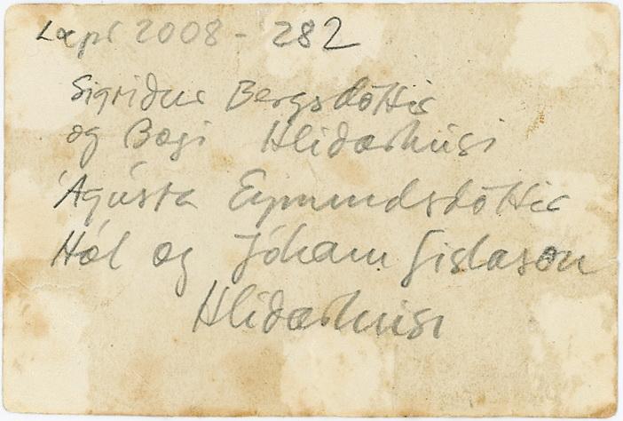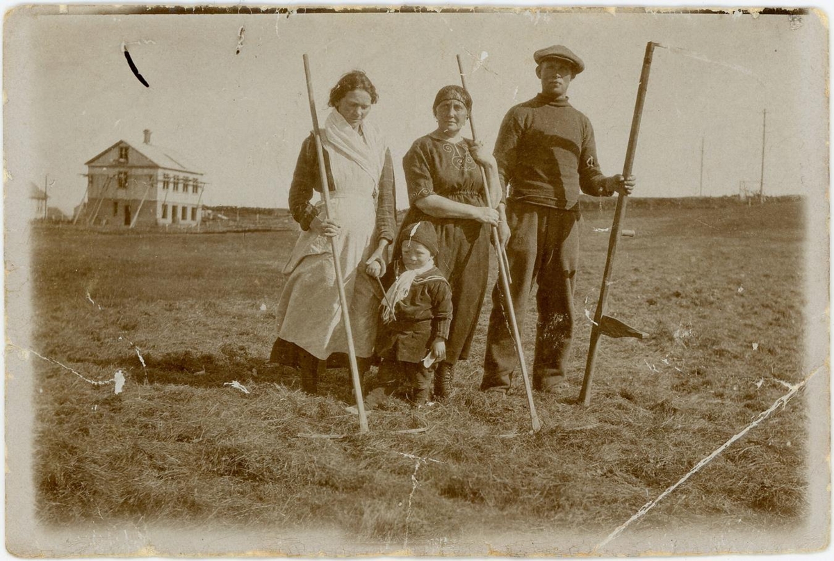 Tvær konur með hrífu og karlmaður með orf og ljá standa á túni í forgrunni, yngri konan heldur í hendi lítils stráks sem stendur hjá þeim. Þau eru t.f.v. Sigríður Bergsdóttir og Bogi Jóhannsson í Hlíðarhúsi, Ágústa Eymundsdóttir í Hól og Jóhann Gíslason í Hlíðarhúsi. Í baksýn t.v er íbúðarhús í byggingu.