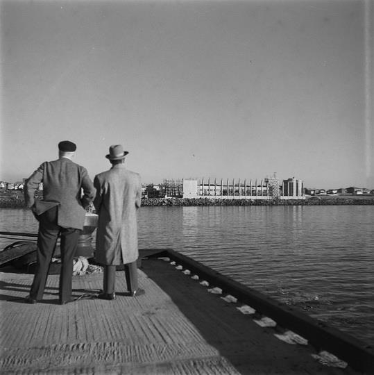 Jón Vestdal og Haraldur Böðvarsson að horfa á framkvæmdir á byggingu Sementsverksmiðjunnar.