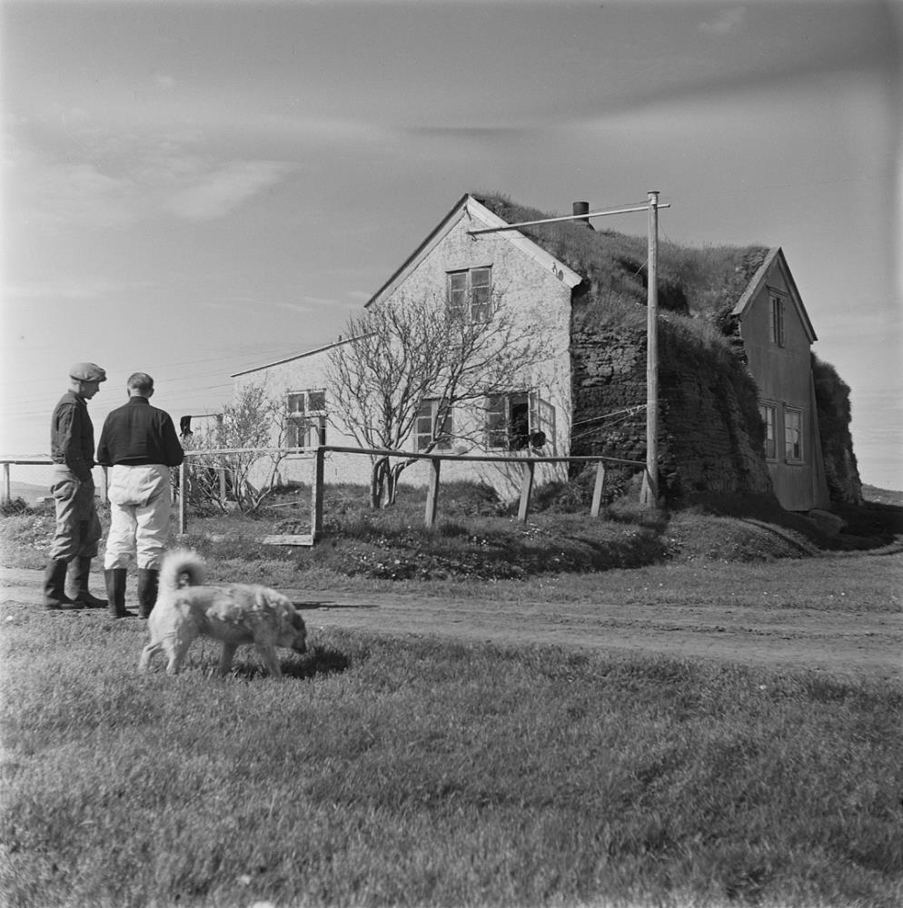 Tannstaðabakki. Gamli bærinn. Maðurinn T.v. Einar Jónsson bóndi Tannstaðabakka, t.h Jón Eyþórsson.