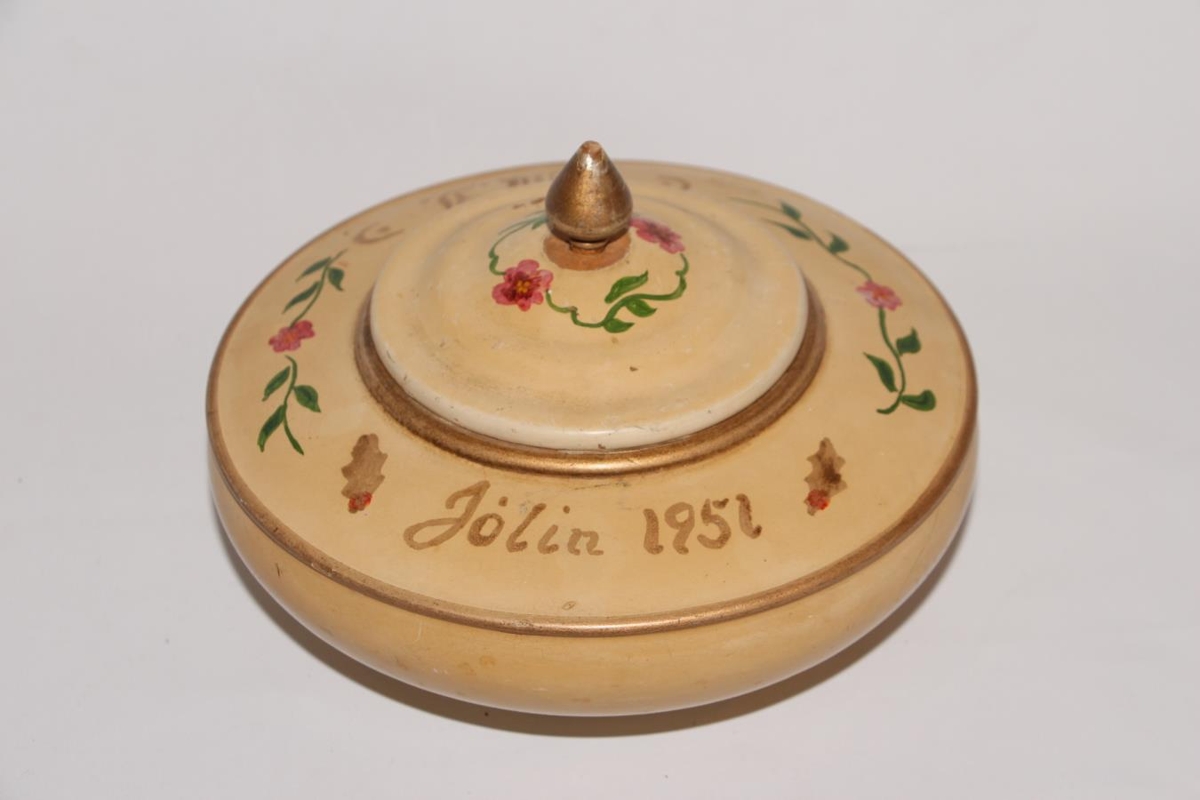 Skál úr tré. H. 7,5 cm, þv. 17,5 cm. Kremuð að lit með rósamynstri - bleik-rauðum og grænum laufblöðum. Gylltar rendur eru á brúnum og með gylltum stöfum stend "M.J. Jólin 1951". Skálin er rennd í rennibekk. Lokið er með gylltum hnúð.