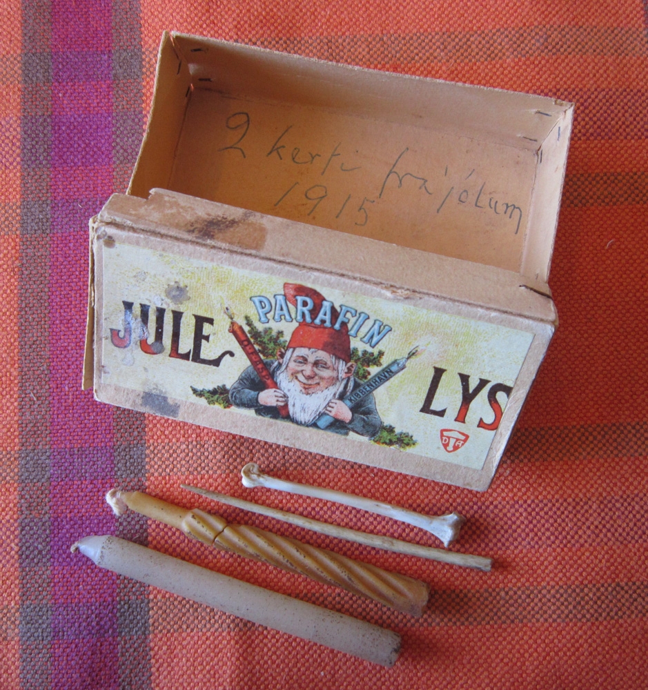 Tvö lítil jólakerti, annað gult og snúið, en hitt hvítt og slétt. Þau eru í pappaöskju með áletruninni: “Paraffin JULELYS”. Innan á botn öskjunnar er skrifað: “2 kerti frá jólum 1915”. Einnig eru í öskjunni tvö fuglabein.