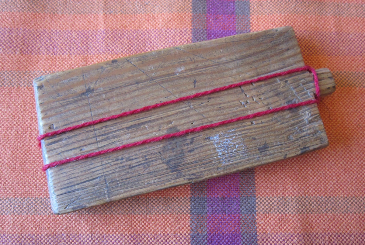 Lítil fjöl, 17 x 7.5 cm, sem óljóst er til hvers var ætluð. Um fjölina er bundið rauðum garnspotta.