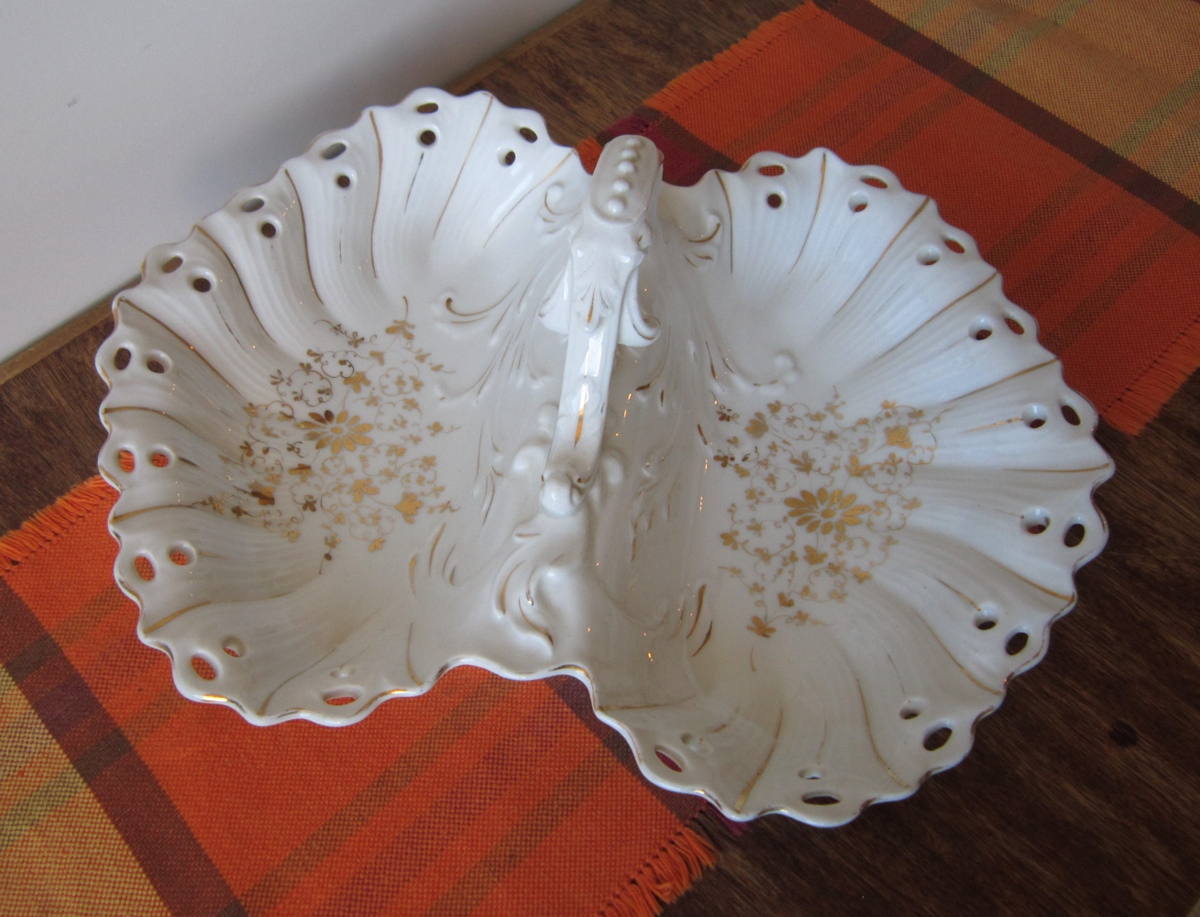 Tvískiptur kökudiskur með handfangi úr hvítu postulíni með gyllingar og gatamunstri, stærð 36 x 28.5 cm, heill og fallegur.