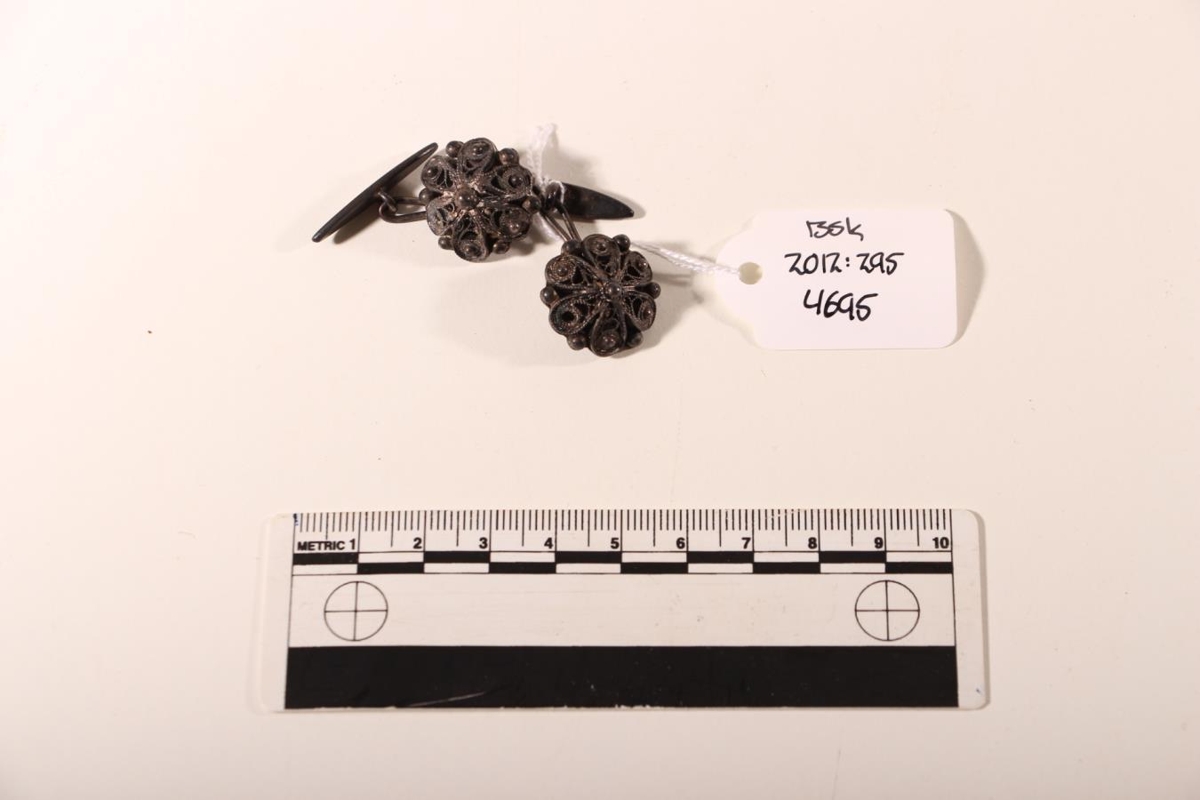 Skyrtuhnappar úr silfri. 2 stk. Þv. 2 cm. Kúptir með víravirki sem á eru kúlur. Annar hnappurinn er annað hvort klaufalega gerður eða hann hefur bráðnað aðeins.