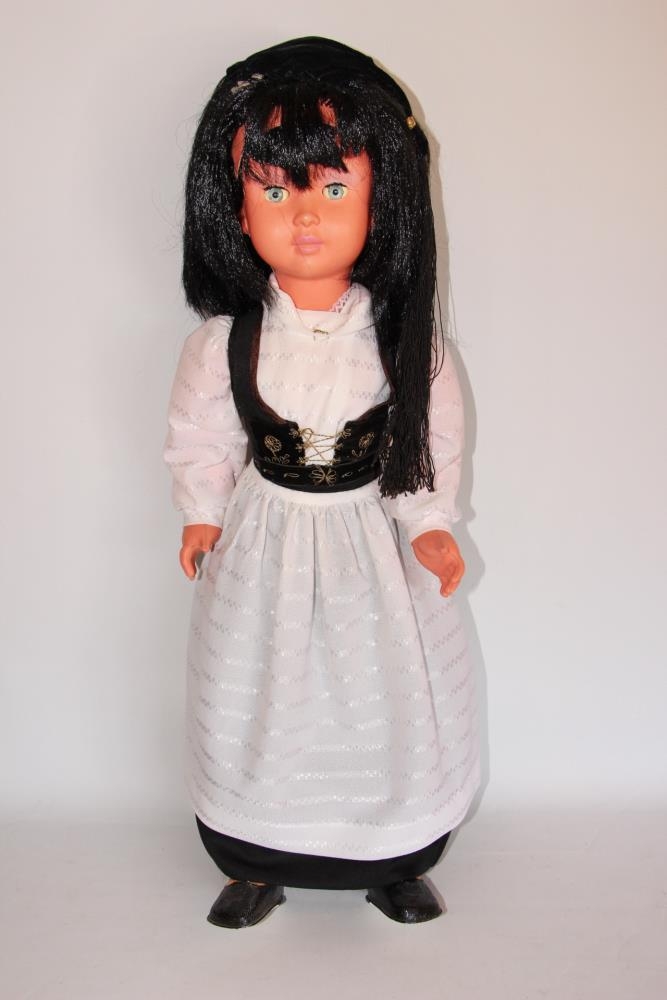 Dúkka (brúða) úr plasti. Hæð 68 cm. Ljós á hörund með svart hér. Er með bleikar varir og augnskugga. Augun eru grá og hún getur lokað augunum. Vinstri handleggurinn er laus.