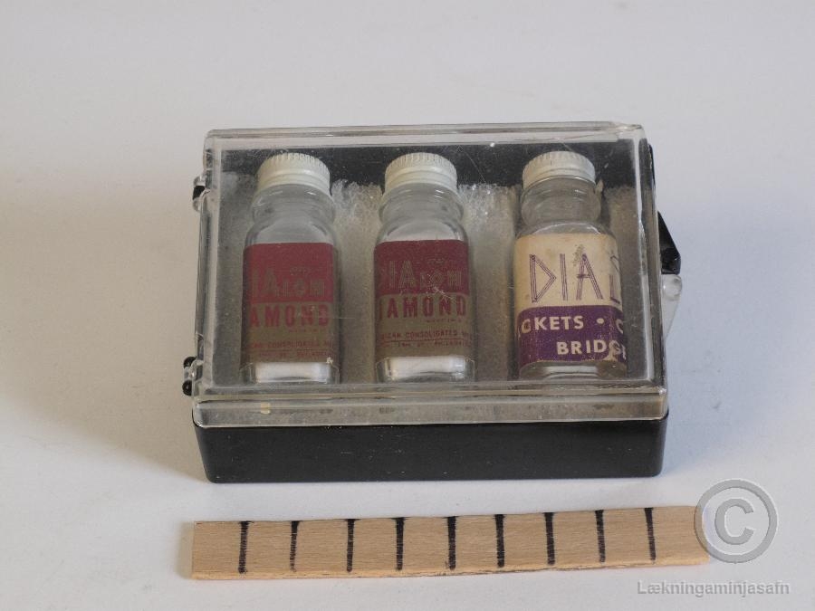 Dialon fyllingarefni frá American Consolidated Mgf. Co. Þrjú glös í plastboxi.
