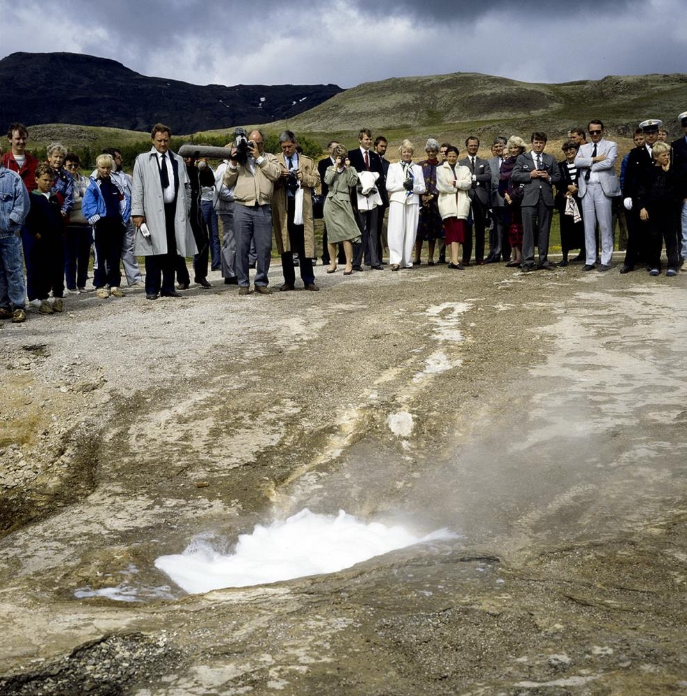 Sænsku konungshjónin og fylgdarlið við Fötu og Strokk. Fata gýs. Karl Gustav 16, Silvia drottning, Vigdís FInnbogadóttir forseti.