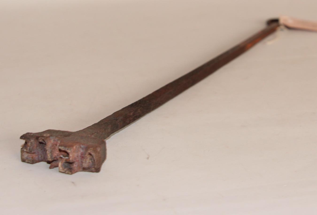 Brennijárn úr eldsmíðaðu járni. L 37,5 cm, stærð á haus er 4,4 cm x 1,5 cm. Brennimarkið er Sj SV.