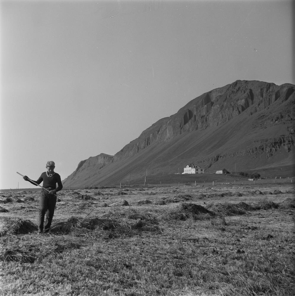 Hvammur í Vatnsdal. Óþekktur drengur við heyskap.