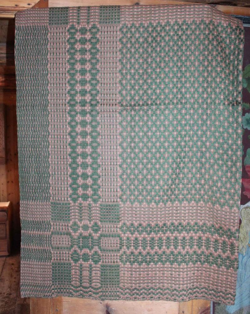 Teppi ofið úr ull og bandi. L. 142 cm br. 83 cm, Símynstrað. Er með blóma og kassamynstri. Litirnir eru drapplitur, grænn, mórauður og rauður. Spunnið og ofið á Staðarfelli í Dölum.