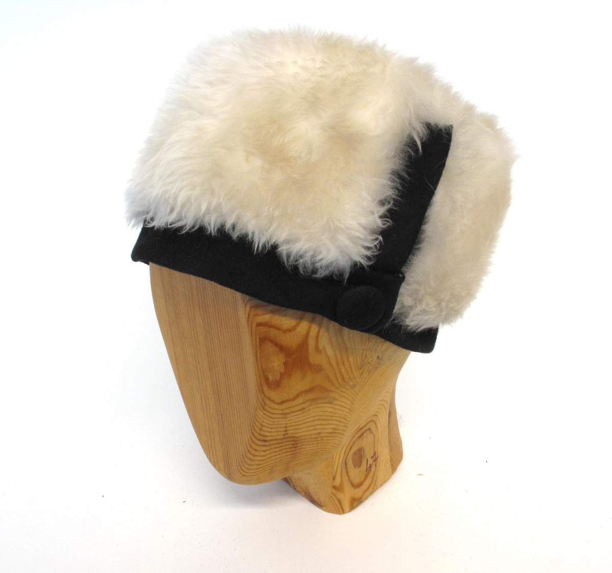 Kvenhattur. Húfa úr hvítu lambaskinni (gæra). Stromplaga með flötum kolli. Svört brún neðst úr jersey-efni, og klauf á einum stað þar sem svarta brúnin nær upp með hliðinni. Þar á mótunum er skrauthnappur, yfirdekktur með sama svarta efninu. Klaufinni er lokað með tveimur smellum. Ómerktur. Sennilega frá 1940-1960.