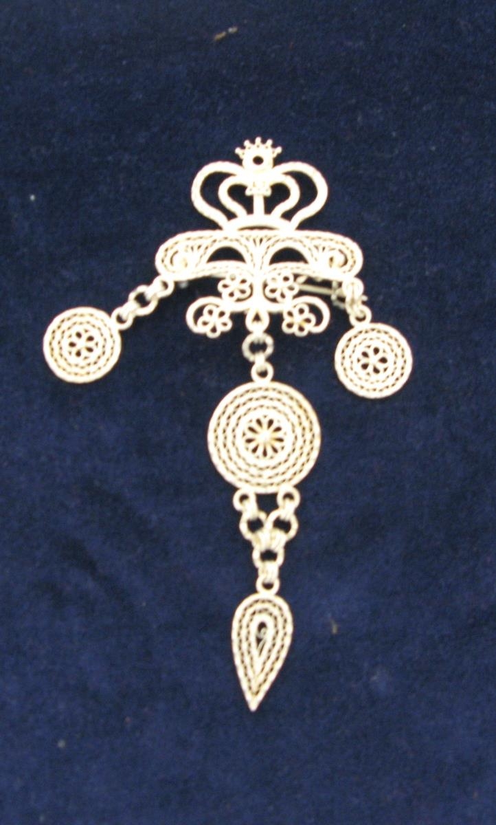 Mjög falleg víravirkisnæla úr silfri. Kóróna efst sem hvílir á víravirkisbekk, og niður úr honum hanga tveir hringir með fjögrablaða rósum í miðju og eins rósir ganga niður úr miðjum bekknum. Þær eru fjórar og ganga niður úr þessum rósabekk og síðan gengur stærri hringur niður úr honum með samskonar rós í miðju. Síðan er eitt lauf niður úr þessum hring. Þessa nælu gerði Erlingur Filippusson grasalæknir, bóndi og silfursmiður sem lauk búfræðinámi frá Eiðaskóla. Hann var fæddur 13.12.1873 og dó 25.01.1967. Kona Erlings var Kristín Jónsdóttir frá Gilsárvöllum í Borgarfirði eystri. Erlingur gaf dóttur sinni Gunnþórunni, móður Kristínar Sveinbjörgu, næluna þegar Kristín dó. Kristín Sveinbjörg var skírð yfir kistu Kristínar ömmu sinnar. Nælan er líklega festar- eða brúðargjöf sem Erlingur smíðaði handa Kristínu. Erlingur lærði silfursmíði af föður sínum Filippusi Stefánssyni í Kálfafellskoti.