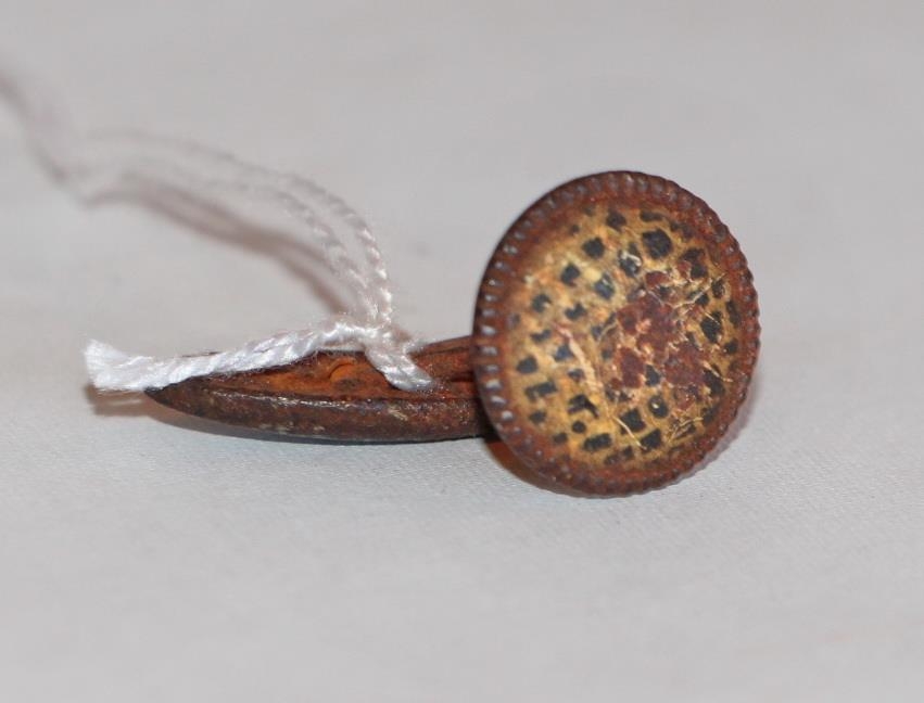 Ermahnappur úr járni. Þv. 1,5 cm. Hefur verið grænn og gylltur köflóttur. Orðinn dálítið ryðgaður.